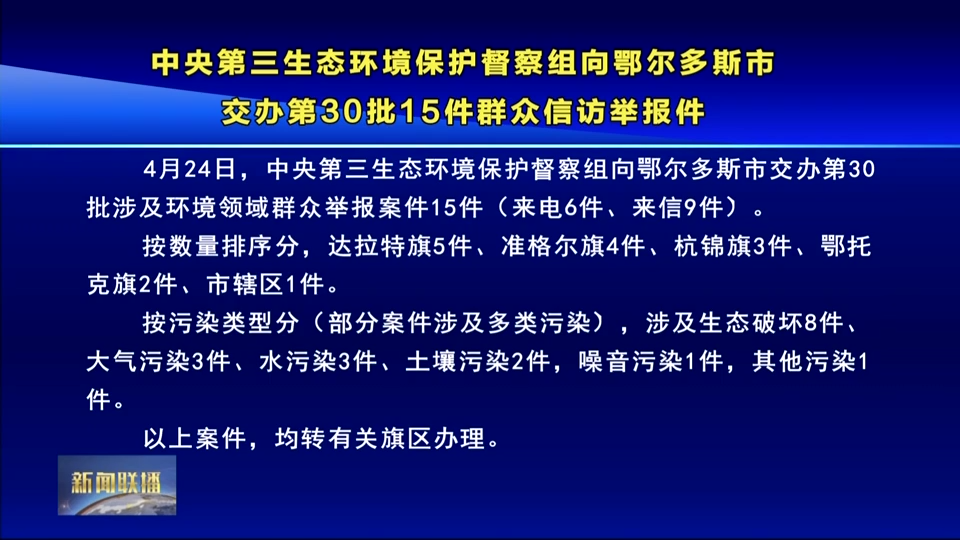 中央第三生态环境保护督察组向鄂尔多斯市交办第30批15件群众信访举报件