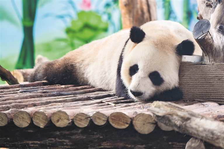 4月25日,在兰州野生动物园熊猫馆,大熊猫“家宝”在休息。 当日,兰州野生动物园熊猫馆正式开馆。熊猫馆总建筑面积2100多平方米,外活动展区总面积为3100多平方米,经国家林业和草原局野生动植物保护司及相关专家验收,认定场馆符合大熊猫居住条件,今后游客可以在兰州野生动物园熊猫馆近距离观看“国宝”大熊猫。 新华社记者 郎兵兵 摄