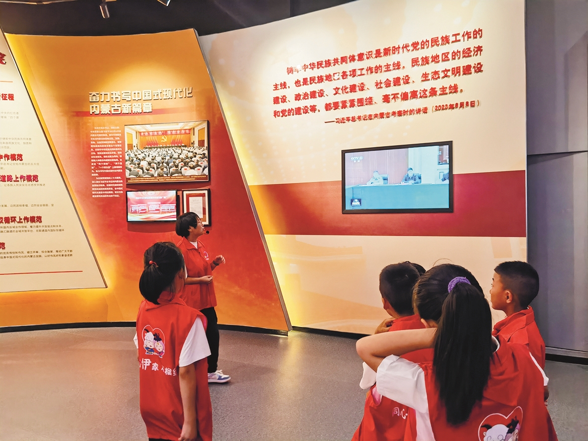 “石榴籽讲解员”在伊金霍洛旗铸牢中华民族共同体意识展览馆进行讲解。