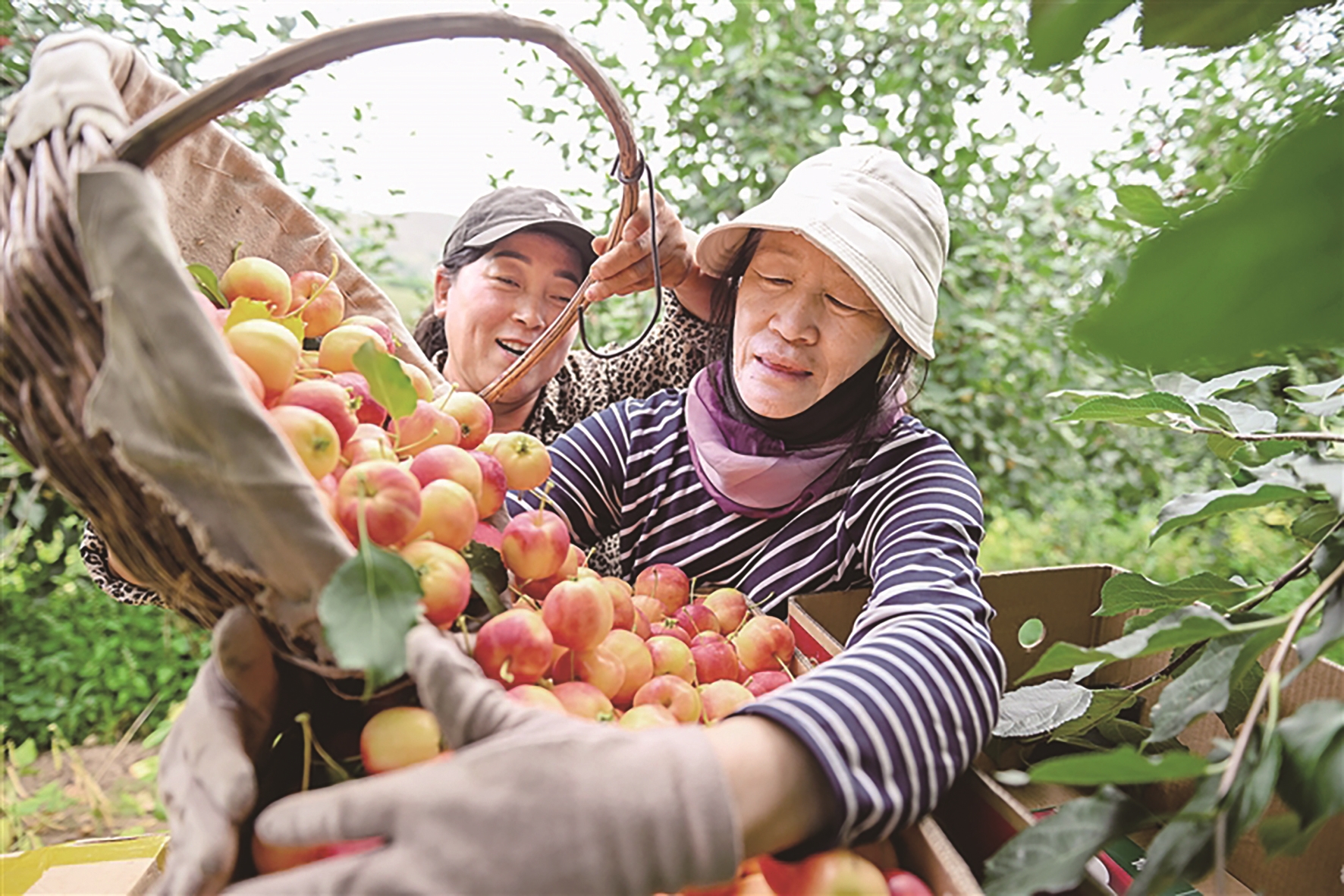 兴安盟科右前旗今年沙果种植面积10.55万亩,盛果期面积约4.5万亩,沙果产业覆盖6000余户果农,预计2025年产值有望突破亿元大关。曾经不起眼的小沙果,如今成为当地百姓的“致富果”。图为果农在科右前旗大石寨镇万亩果园采摘沙果。 王磊 摄