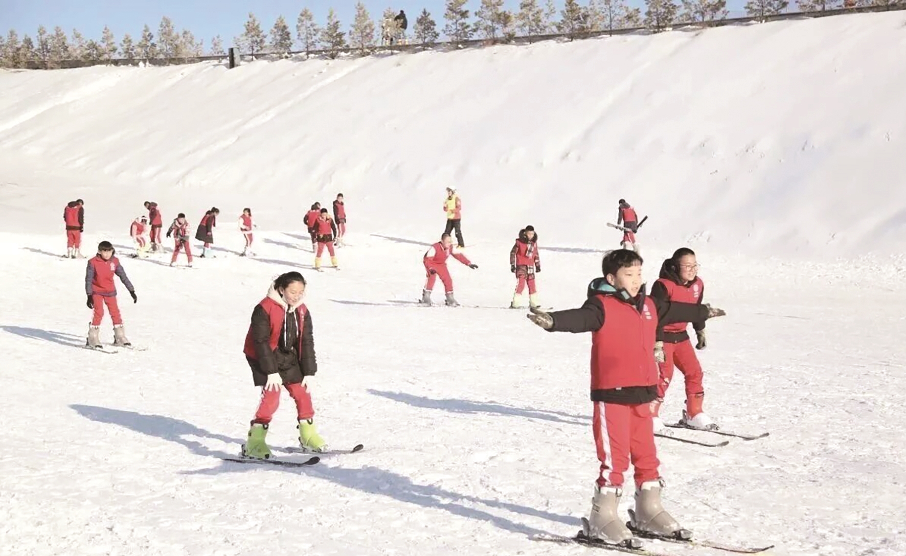 近日,在鄂尔多斯文化产业园万舟滑雪场,专业教练手把手指导小朋友们滑雪技巧,并提醒大家安全滑雪、文明出游。 鄂轩 摄