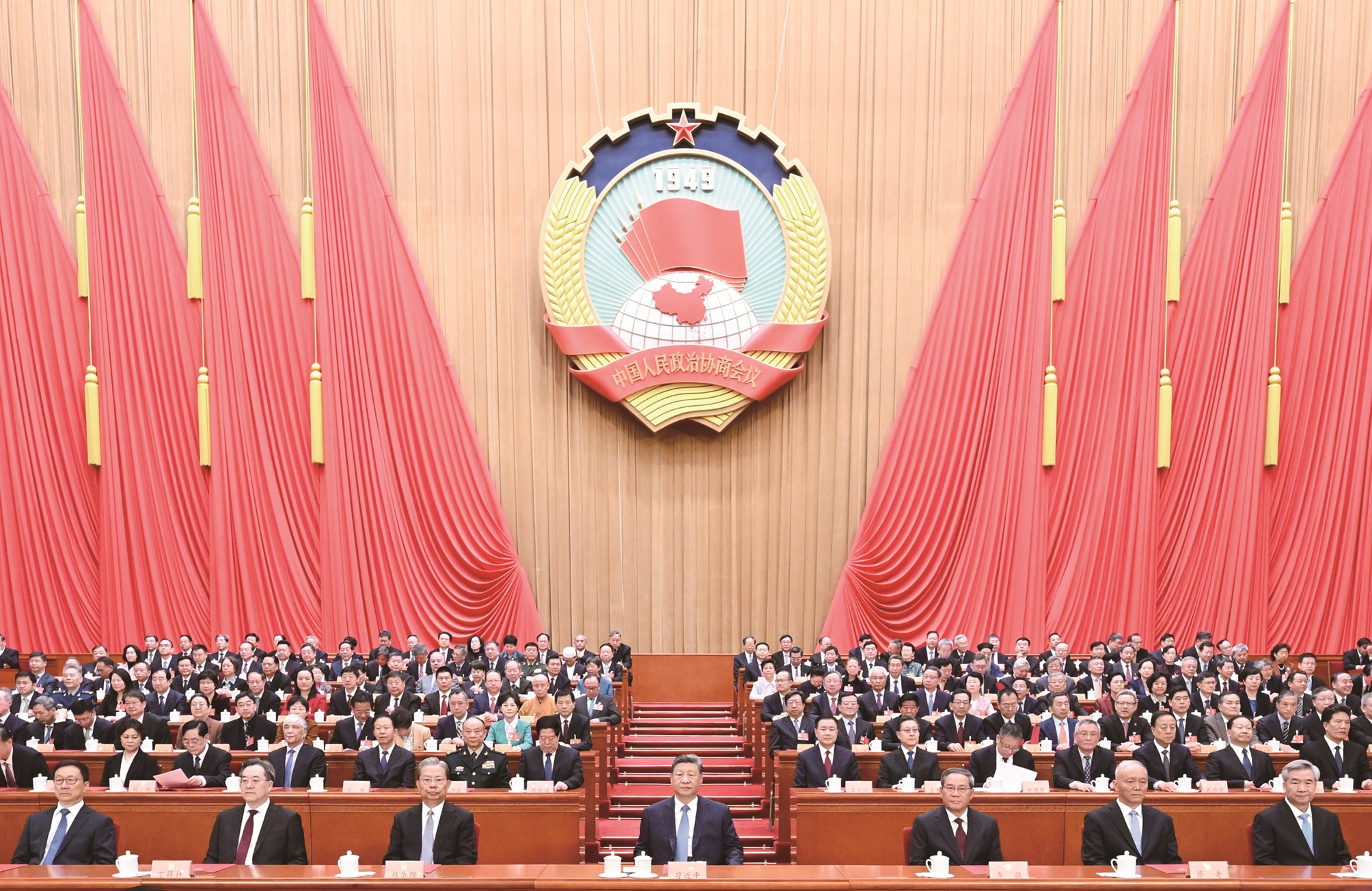 3月11日上午,中国人民政治协商会议第十四届全国委员会第四次会议在北京人民大会堂闭幕。这是习近平、李强、赵乐际、蔡奇、丁薛祥、李希、韩正在主席台就座。 新华社记者 燕雁 摄