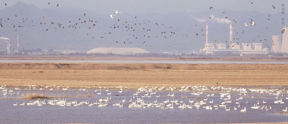 达拉特旗 达拉特旗境内的黄河湿地迎来了春季候鸟迁徙小高峰,数万只天鹅、灰鹤、赤麻鸭等北迁候鸟陆续抵达,在此停歇觅食。