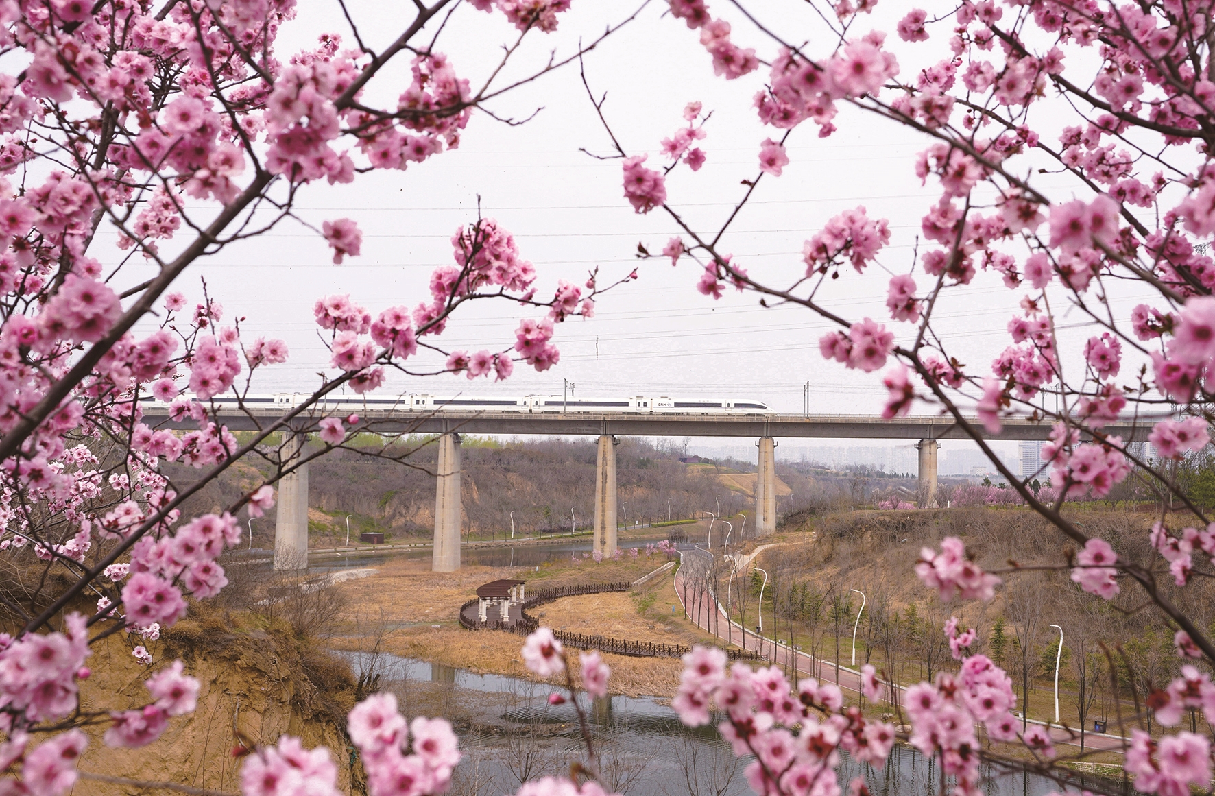 近日,一列高铁列车驶过路边开满鲜花的徐兰高速铁路郑州段。 当黛色群峰披上鹅黄嫩绿的轻纱,当无垠原野晕开斑斓绚丽的油彩,春便浩浩荡荡地来了。这组影像,记录着大地初醒的脉搏:是暖树枝头的鸟鸣,是花间明媚的笑靥,是千山披翠、万水含烟的盛景。春满山河,人间正暖。 新华社发 马健 摄