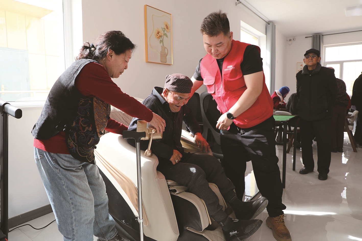 近年来,我市加快推动养老服务中心建设,完善基层服务网络,丰富养老服务功能,让老年人在家门口即可享受照护、康复、休闲娱乐等一体化服务,不断增强老年人的获得感、幸福感、安全感。图为近日,杭锦旗伊和乌素苏木区域养老服务中心正式启用,老年人在工作人员引导下体验服务项目。 贺容容 阿拉腾其木格 摄