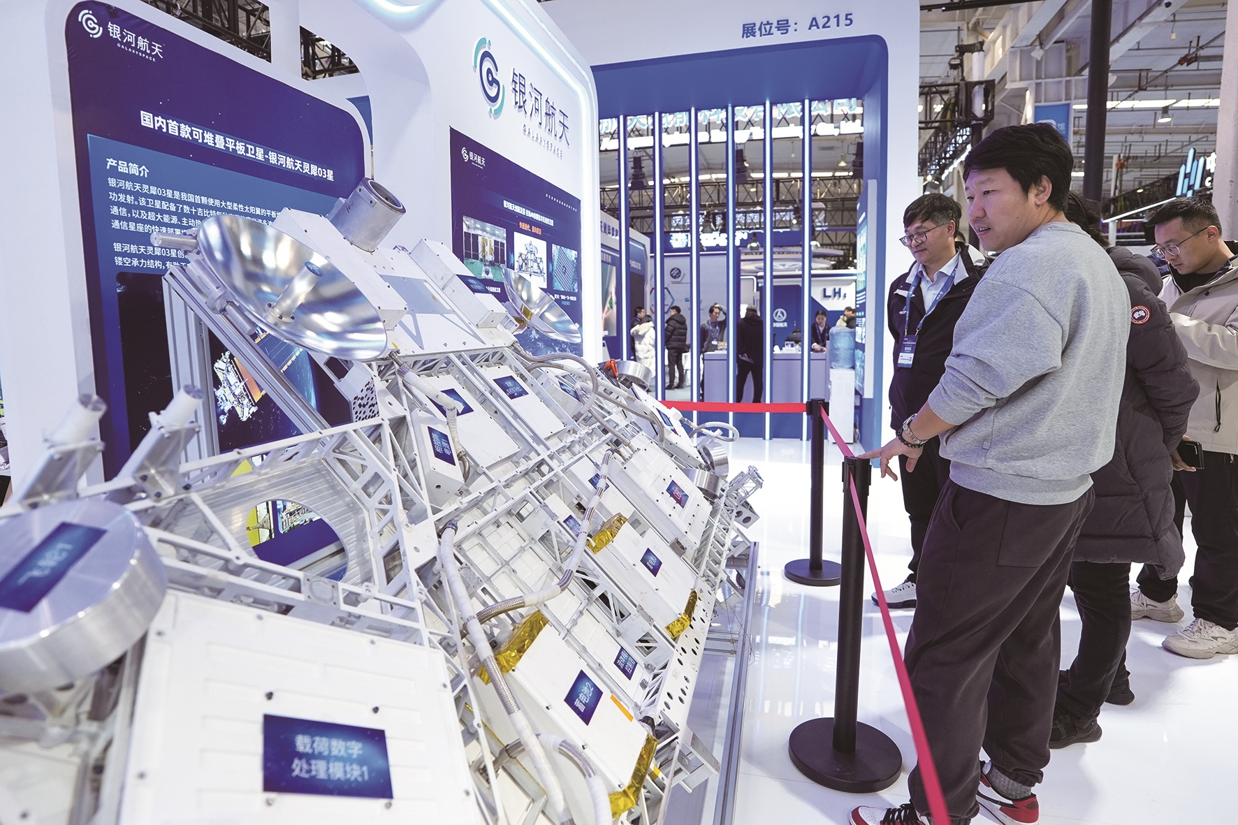 2026年1月23日,观众在2026北京国际商业航天展的银河航天展台参观展出的可堆叠平板卫星“灵犀03星”模型。 新华社记者 鞠焕宗 摄