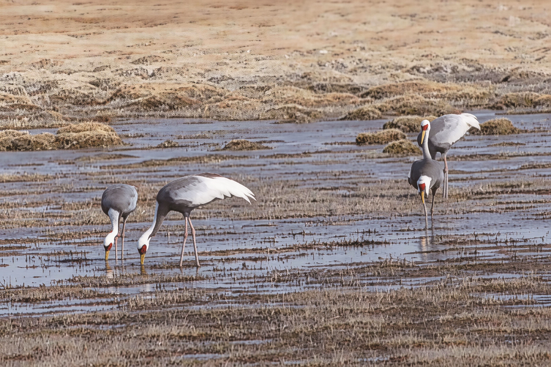 日前,5只国家一级重点保护野生动物白枕鹤在中国石油长庆油田苏里格南作业分公司苏南—C3区自主贡献型生物多样性保护地的浅水湿地旁现身。 白枕鹤又名红面鹤,是全球易危物种、国家一级重点保护野生动物。据了解,目前全球该种群数量仅约1.3万只,在我国越冬数量不足500只。作为湿地生态环境的“指示性物种”,白枕鹤对栖息地的水质、食物源和安静程度极其挑剔。 可发 摄