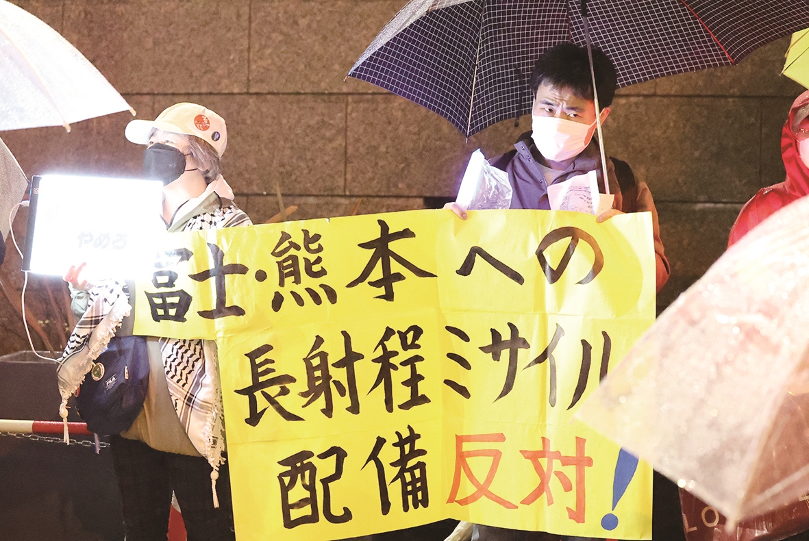 3月31日,民众在日本东京的日本防卫省门前集会抗议政府在熊本县和静冈县部署具备“对敌基地攻击能力”的远程导弹。 31日晚间,日本多地民众举行集会,抗议政府强行部署远程导弹。日本防卫大臣小泉进次郎当日在记者会上宣布,在熊本县和静冈县部署了具备“对敌基地攻击能力”的远程导弹。 日本媒体评论称,这是日本首次部署此类导弹,标志着曾经奉行“专守防卫”原则的日本防卫政策已经发生转变。 新华社记者 岳晨星 摄