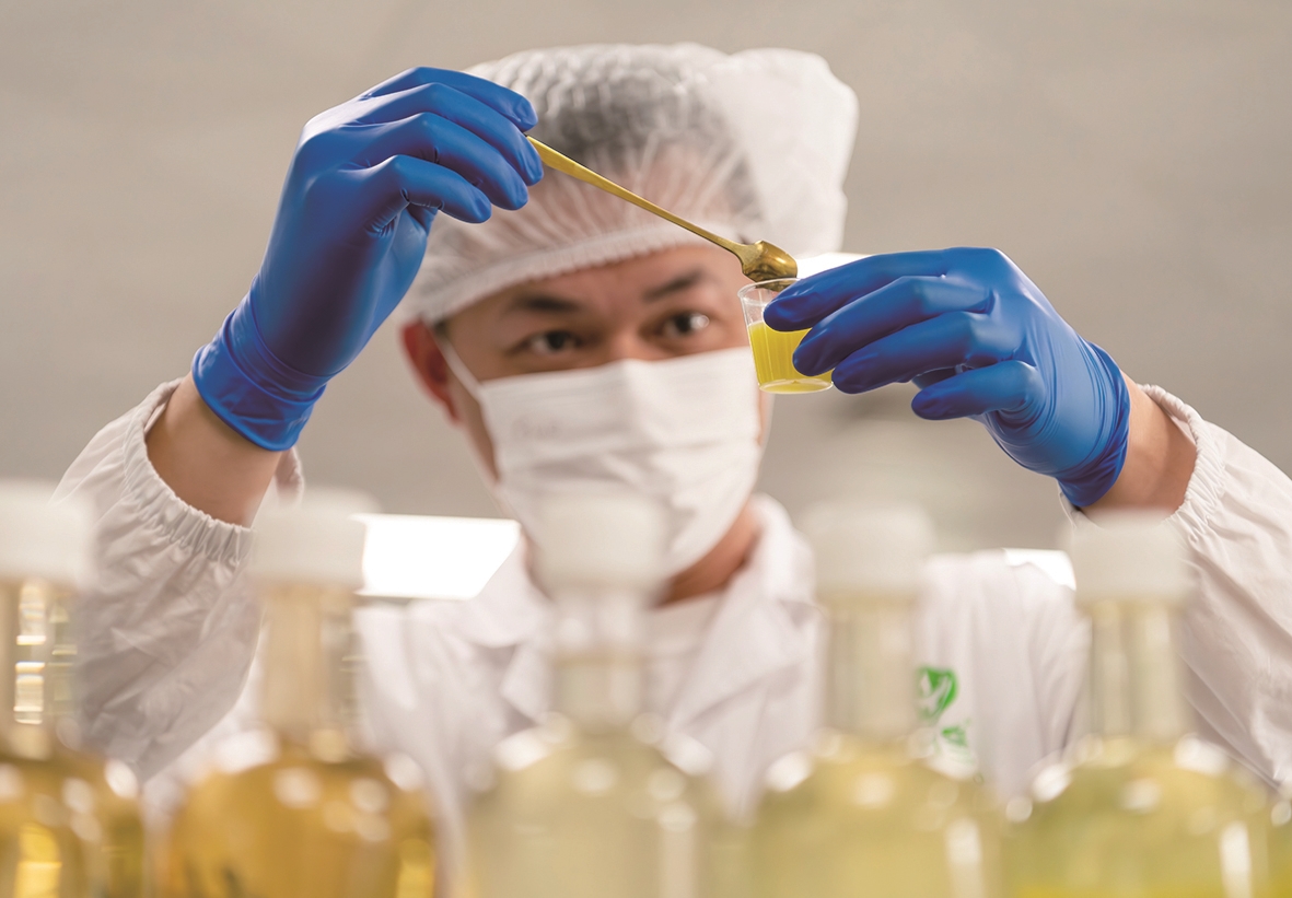 2025年3月26日,在位于福建省漳州市的中宝(福建)食品科技有限公司技术中心,技术人员检验芒果饮料。 新华社记者 魏培全 摄