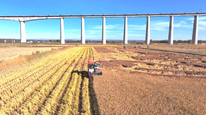 乌审旗漠楠农机专业合作社负责人高海涛告诉记者:“我们现在6台收割机在收,每天大概收个800多亩吧。”