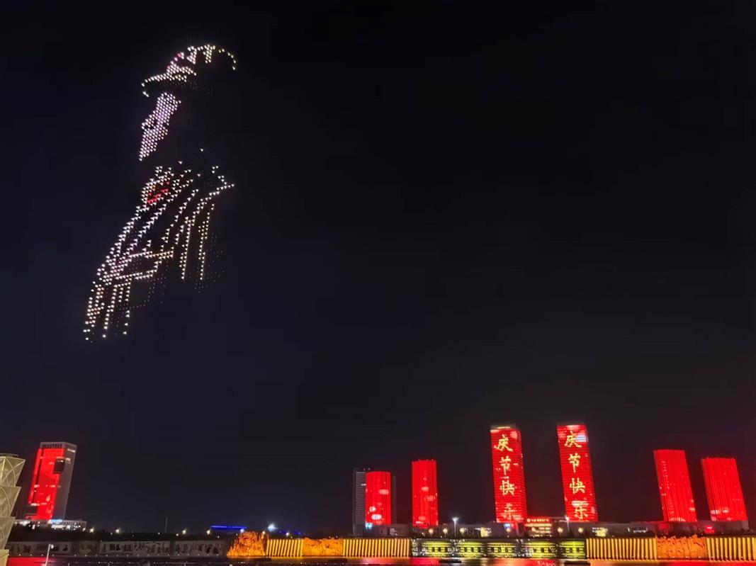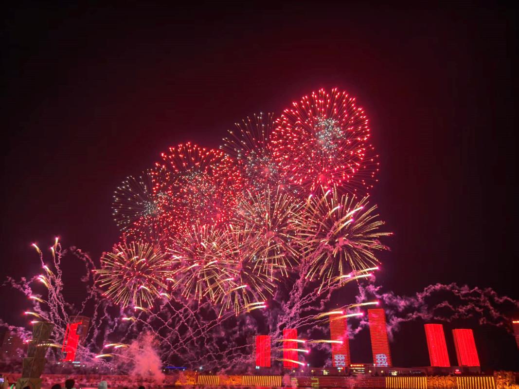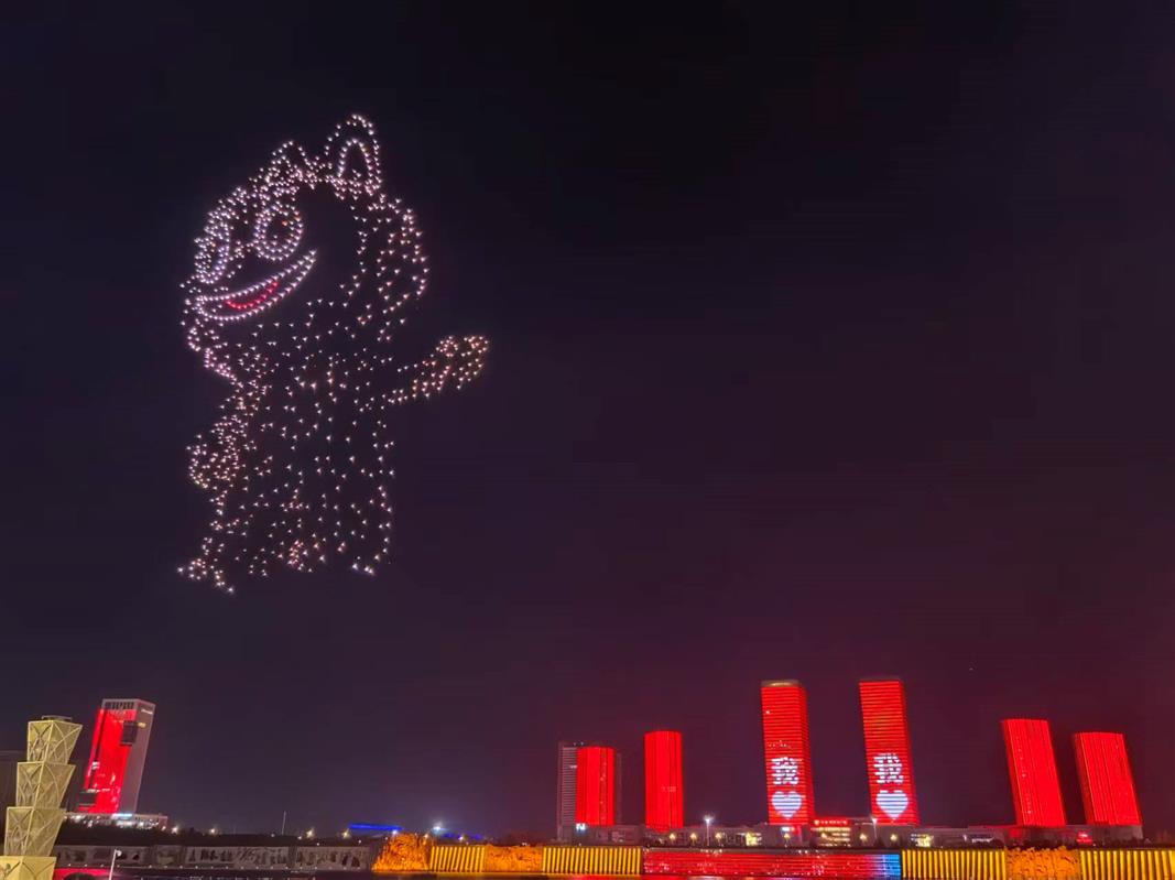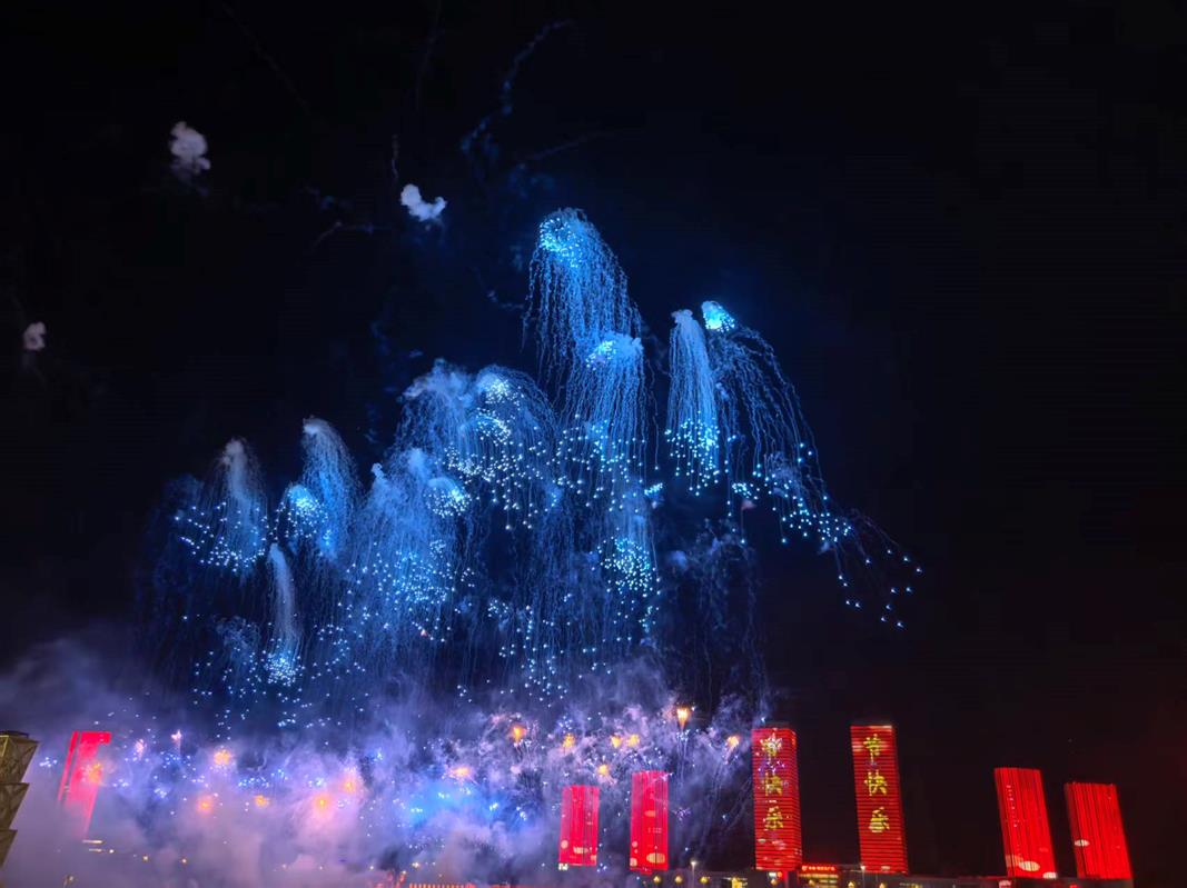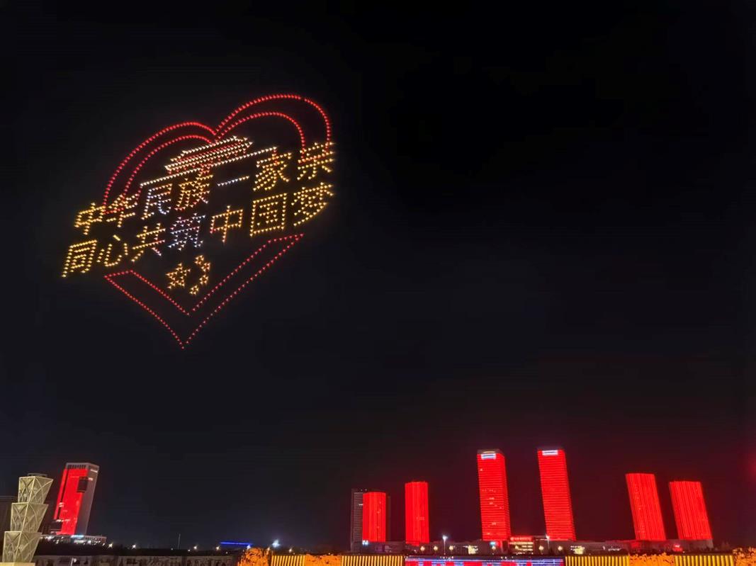 今晚的表演不仅是传统的烟花秀,更是一场融合现代科技的视觉盛宴。1000架无人机在夜空中不断变换队形,与特制烟花共同描绘出“中华民族一家亲 同心共筑中国梦”、五星红旗等图案,引来观众阵阵惊叹。
