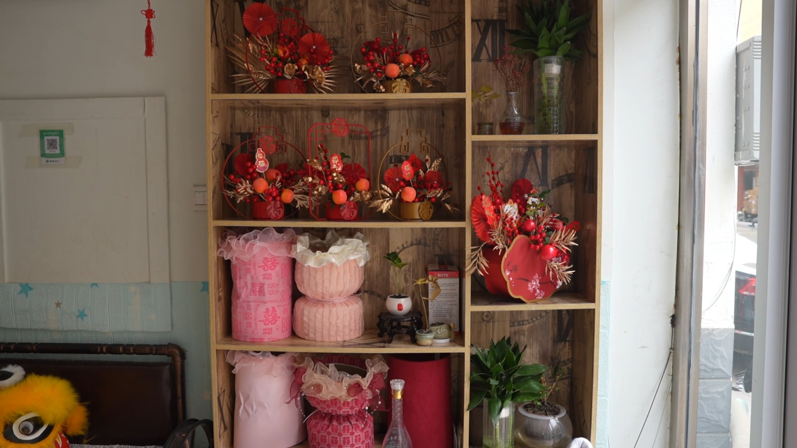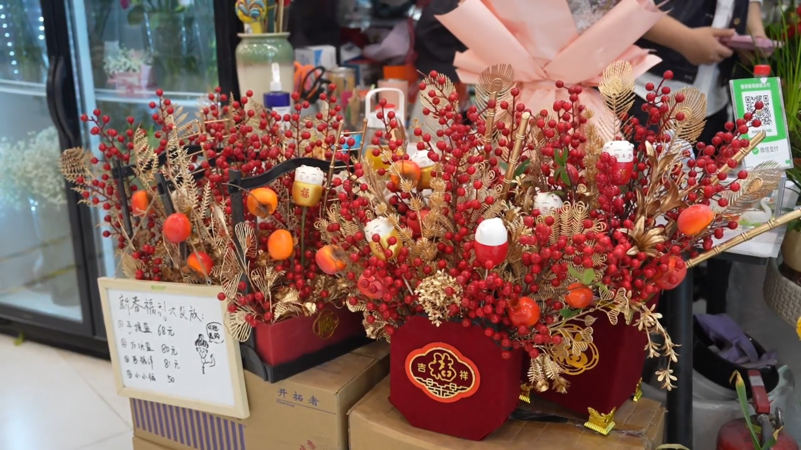 除传统鲜花外,造型别致、寓意美好的仿真年宵花“福桶”成为今年市场新晋爆款,备受青睐。在一家花艺店内,店员们正忙着修剪花枝、搭配装饰物,将银柳、冬青等吉祥花材与金色叶片、喜庆挂饰精心组合,一个个年味十足的福桶很快成型,精致讨喜。“我们做了多种款式福桶,主要用银柳、冬青搭配金色叶片,将‘金玉满堂’‘马年纳福’等美好寓意融入其中。”准格尔旗觅裳花店员工吕思怡说。
