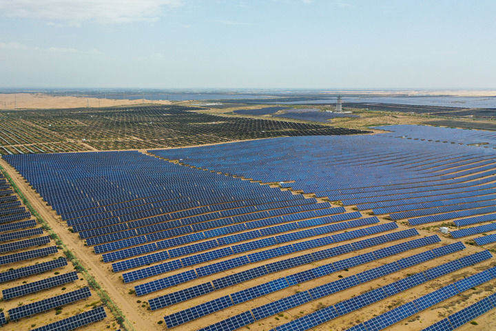 走进乌兰布和沙漠,光伏板形成的“蓝色海洋”闪着耀眼光芒。这一沙漠约三分之一的面积在巴彦淖尔市磴口县,是内蒙古实施防沙治沙和风电光伏一体化工程的重点地区。磴口县委书记刘向阳说,磴口县抓住新能源发展机遇,现已建和批复在建新能源装机达542.66万千瓦,“光伏+生态治理”面积13.6万亩。“全县已在光伏板间种植3.73万亩梭梭和四翅滨藜,通过打造‘新能源+碳汇林+药材+畜牧业’的一体化生态修复模式,三年后可实现产值8000万元左右。”