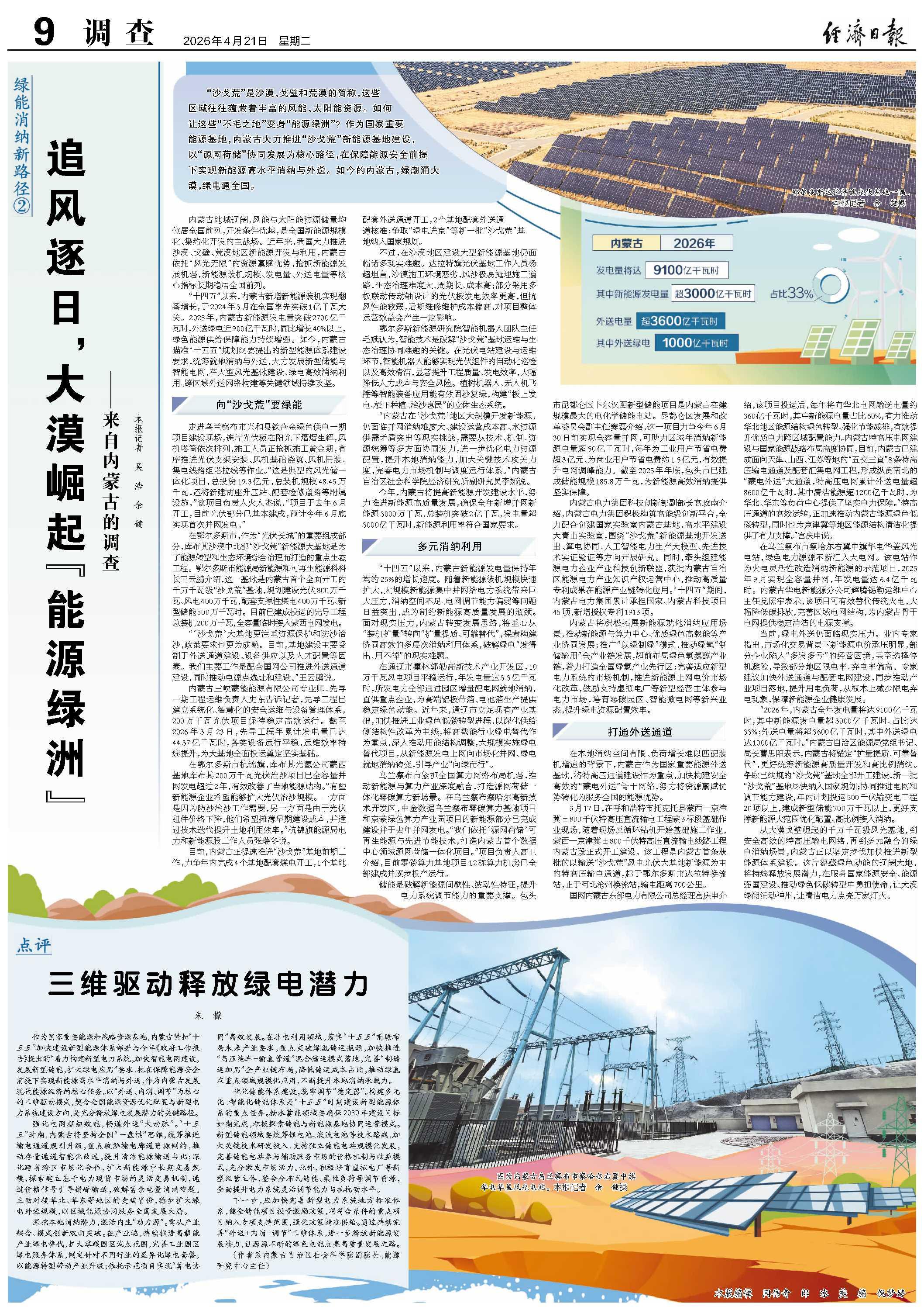 从大漠戈壁崛起的千万千瓦级风光基地,到安全高效的特高压输电网络,再到多元融合的绿电消纳场景,内蒙古正以坚定步伐加快推进新型能源体系建设。这片蕴藏绿色动能的辽阔大地,将持续释放发展潜力,在服务国家能源安全、能源强国建设、推动绿色低碳转型中勇担使命,让大漠绿潮涌动神州,让清洁电力点亮万家灯火。本报记者 吴 浩 余 健