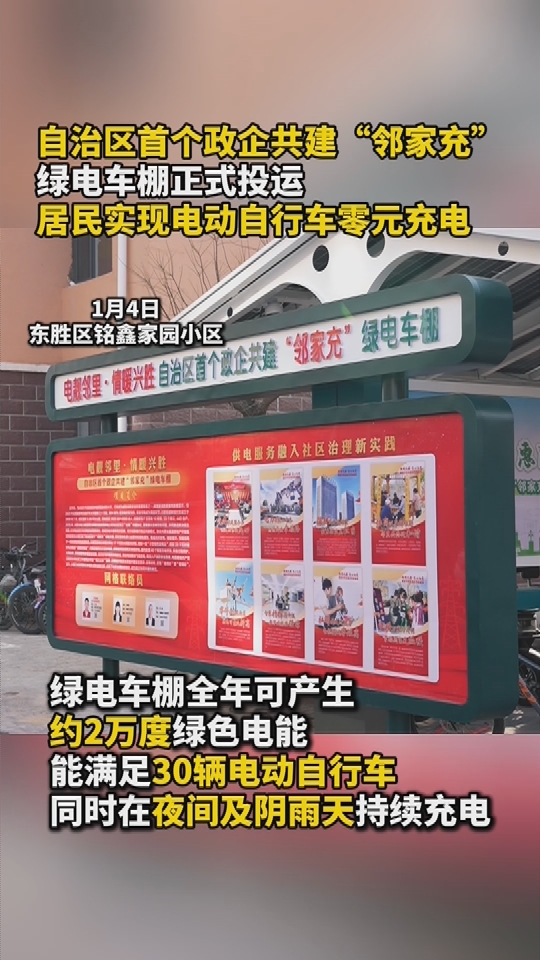 自治区首个政企共建“邻家充”绿电车棚正式投运,居民实现电动自行车零元充电