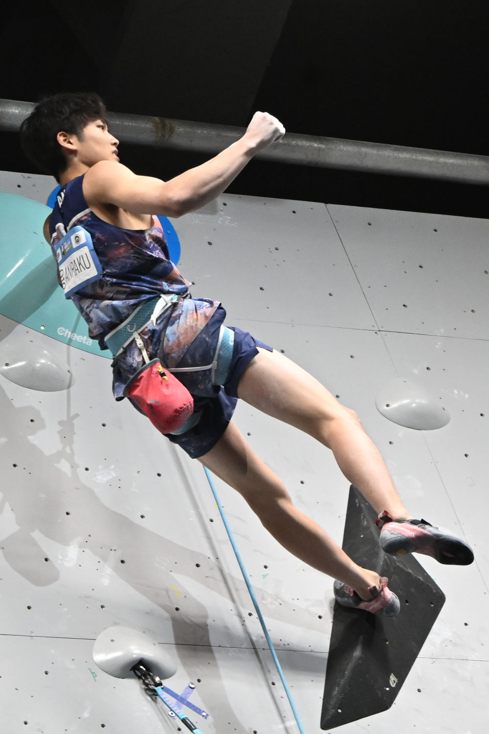 男子难度决赛中,18岁的日本名将安乐宙斗轻松登顶并夺金,这也是他新赛季连续两站夺金。一周前,他在柯桥站夺得了男子攀石赛冠军。中国选手潘愚非名列第五。