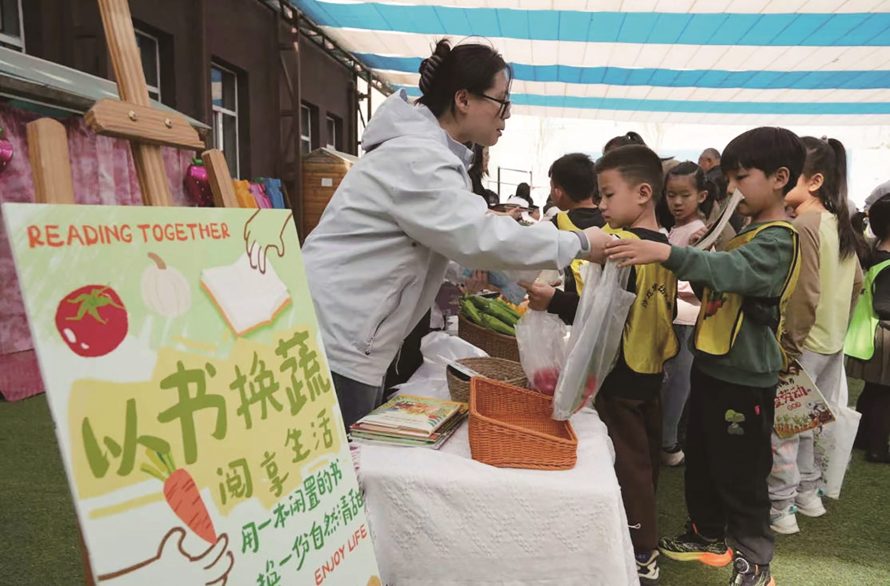 ▼准格尔旗沙圪堵第一幼儿园开展“以书换蔬”共享阅读活动。王丽曼 摄