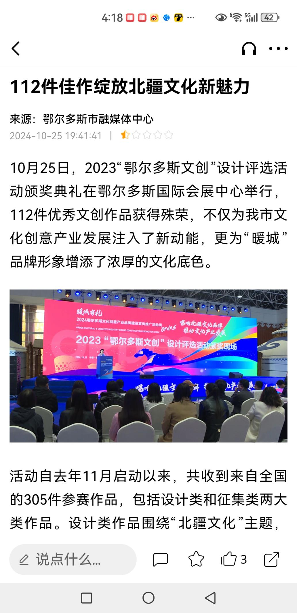 (一)坚持文化传承,做好北疆文化宣传。持续深刻领悟习近平文化思想的丰富内涵、精神实质和实践要求,发挥主流媒体作为传播主流文化重要力量的关键作用,结合全区、全市宣传部长会议要求,实施“北疆文化建设提升行动”。北疆文化宣传亮点纷呈,本地文化风景线绘声绘色。充分挖掘鄂尔多斯丰富的历史文化和人文资源,聚焦“唱响北疆文化品牌 鄂尔多斯在行动”专栏建设,持续推出高质量特色新闻作品,采制播发的《内蒙古鄂尔多斯:非遗文化过大年》《内蒙古鄂尔多斯:凤凰山汉墓壁画》等作品在央视首屏首页等重点位置刊发转载,总计阅读量超1亿,以“鄂尔多斯文化神州行”等各类文旅招商推介活动为平台,带领各地市民真切感受祖国北疆独具特色的地域文化和历史文脉。2024年被内蒙古广播电视台授予《向祖国汇报——美丽内蒙古·北疆“剧”精彩》庆祝中华人民共和国成立75周年精品广播剧展播优秀组织奖。