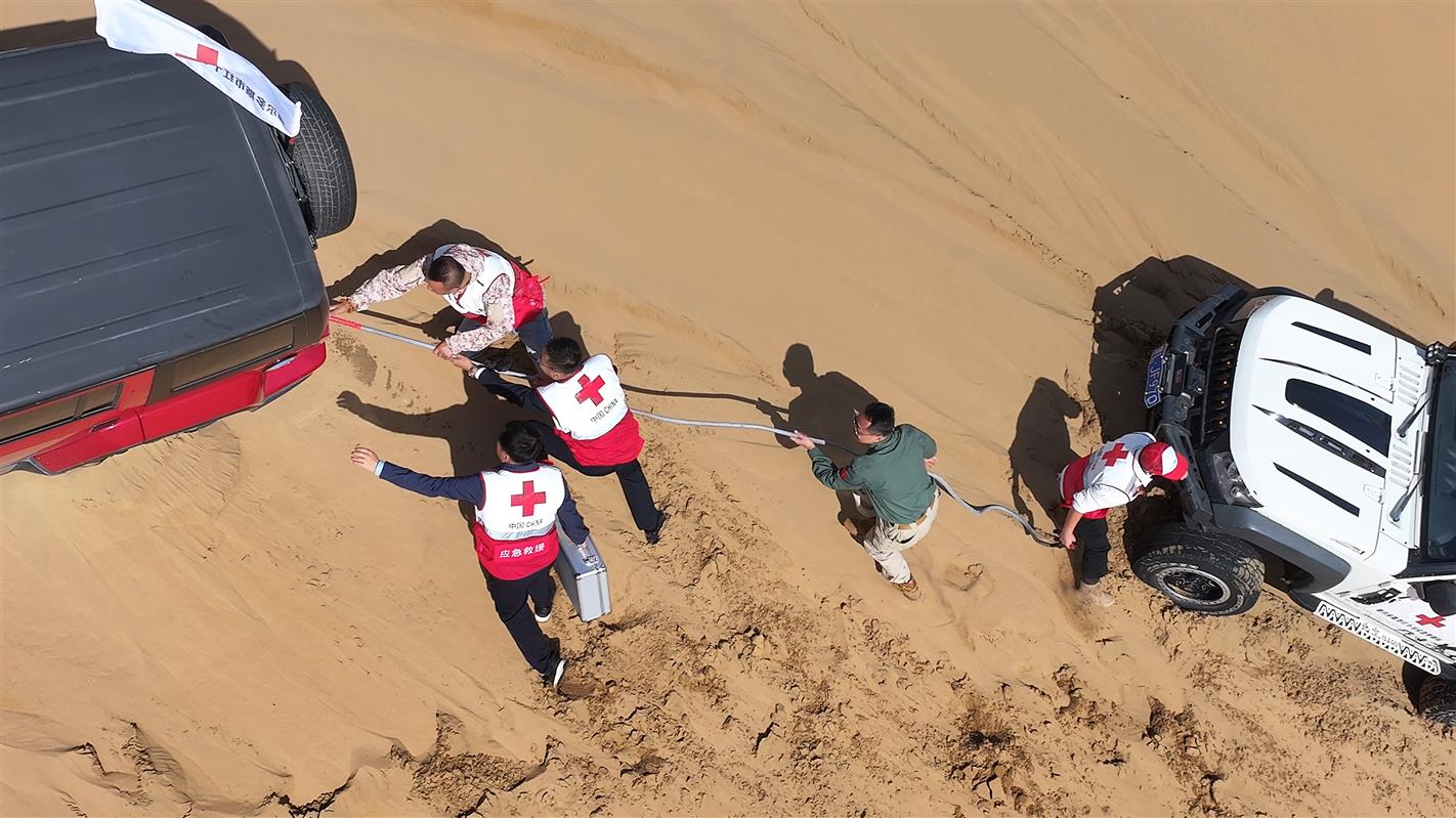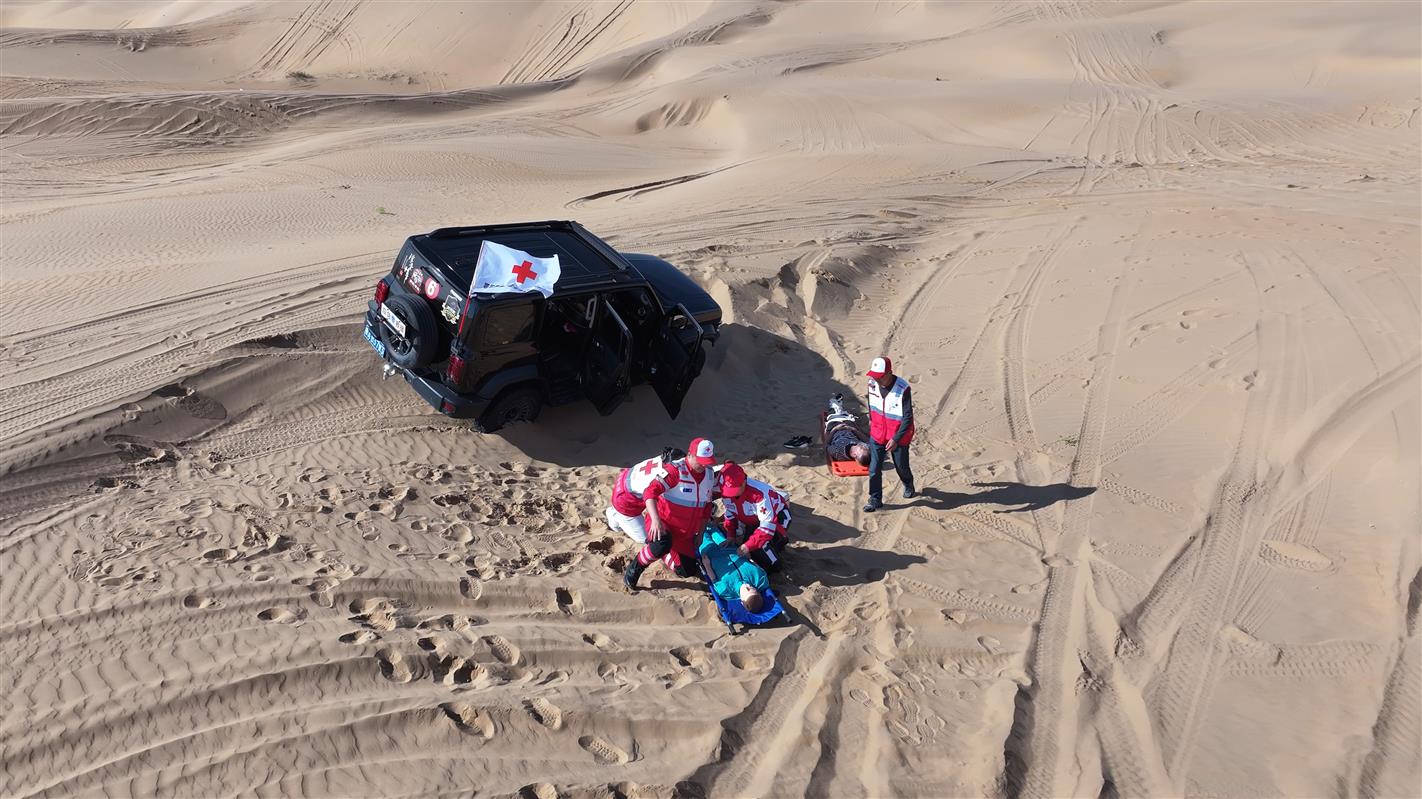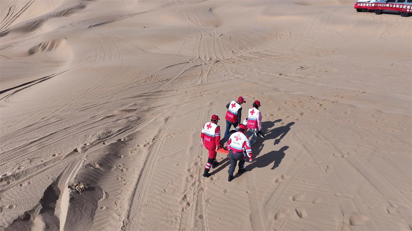 9月18日,沙漠救援先锋——2025鄂尔多斯市应急救援综合演练在达拉特旗举行。市红⼗字救援队、各旗区红⼗字救援队⻣⼲队员及志愿者共计100余人参加了演练。