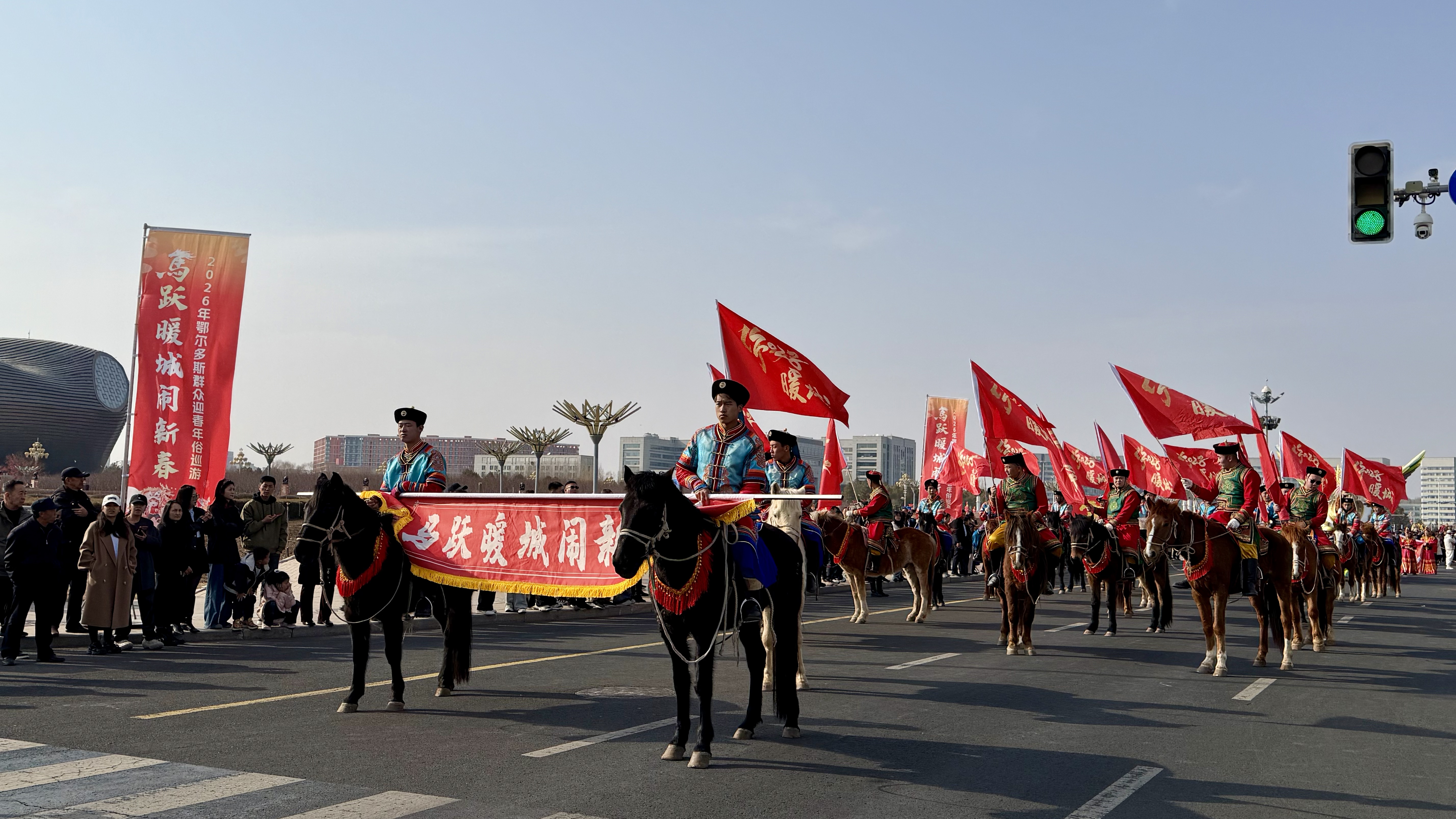 作为本次全市巡游的核心亮点,康巴什区“马跃暖城闹新春”鄂尔多斯群众迎春年俗城市巡游秀在城市中轴线精彩上演。2公里行浸式巡游路线精心布局,串联起3处巡游展演点位、3处定点表演区,16支多元化巡游演出团队、600余名演职人员全程参与,打造出一条集观赏性、互动性于一体的沉浸式流动演艺长廊。
