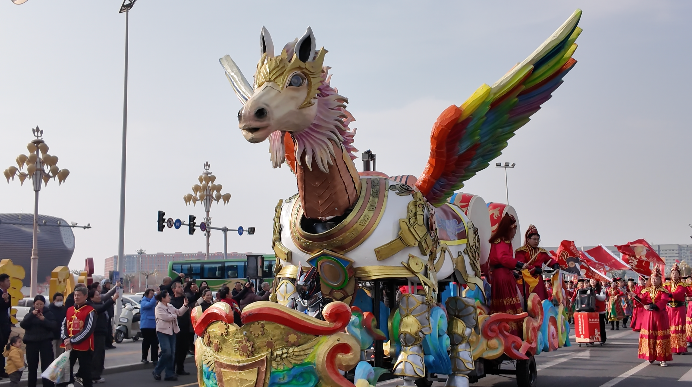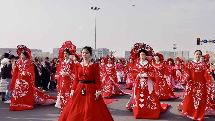 在东胜区青铜文化广场、鄂尔多斯大街等路段,花车造型精美、寓意吉祥,融合剪纸、刺绣等,将东胜本土文化特色与非遗元素巧妙结合,搭配舞龙舞狮、陕北秧歌、二人台等精彩纷呈的非遗民俗表演,一路欢歌一路景,让城市街头成为流动的文化盛宴。
