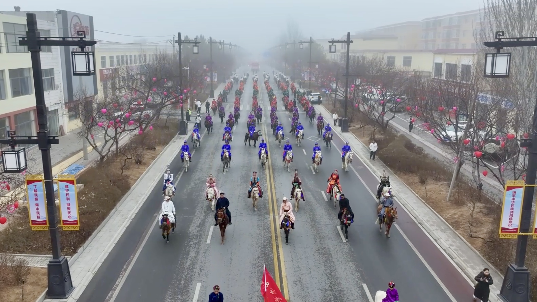 在乌审旗,马队方阵由两名小骑手策马领衔,上百名农牧民与乌兰牧骑队员身着盛装相继登场,悠扬的歌声与铿锵的马蹄声交织,街边观众欢呼互动、拍照留念。马背上的国风方阵将唐装、中国风与马元素巧妙融合,鲜艳的民族服饰与节日装扮相映成趣,街头巷尾洋溢着各民族团结奋进的浓浓年味。“今年乌审旗的巡游让我们感受到了万马奔腾的气势,也感受到了我们各族儿女心连心的热闹劲儿!”乌审旗居民杨永霞杨丽表示。