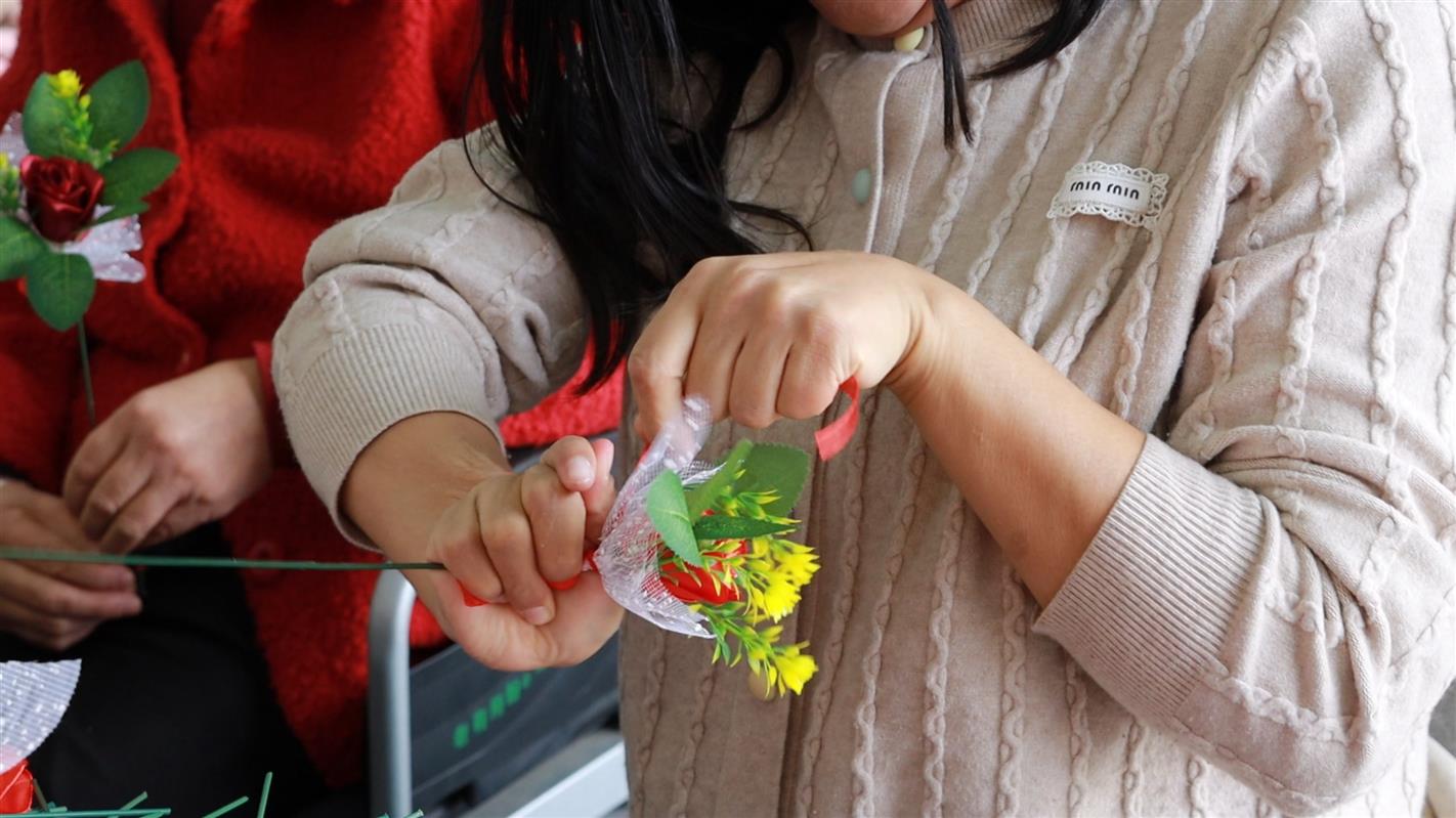 “看到他们制作丝带玫瑰挺辛苦,我就想过来给他们搭把手,为他们分担一些,我心里觉得很温暖、很有意义。”志愿者刘彩芳说。