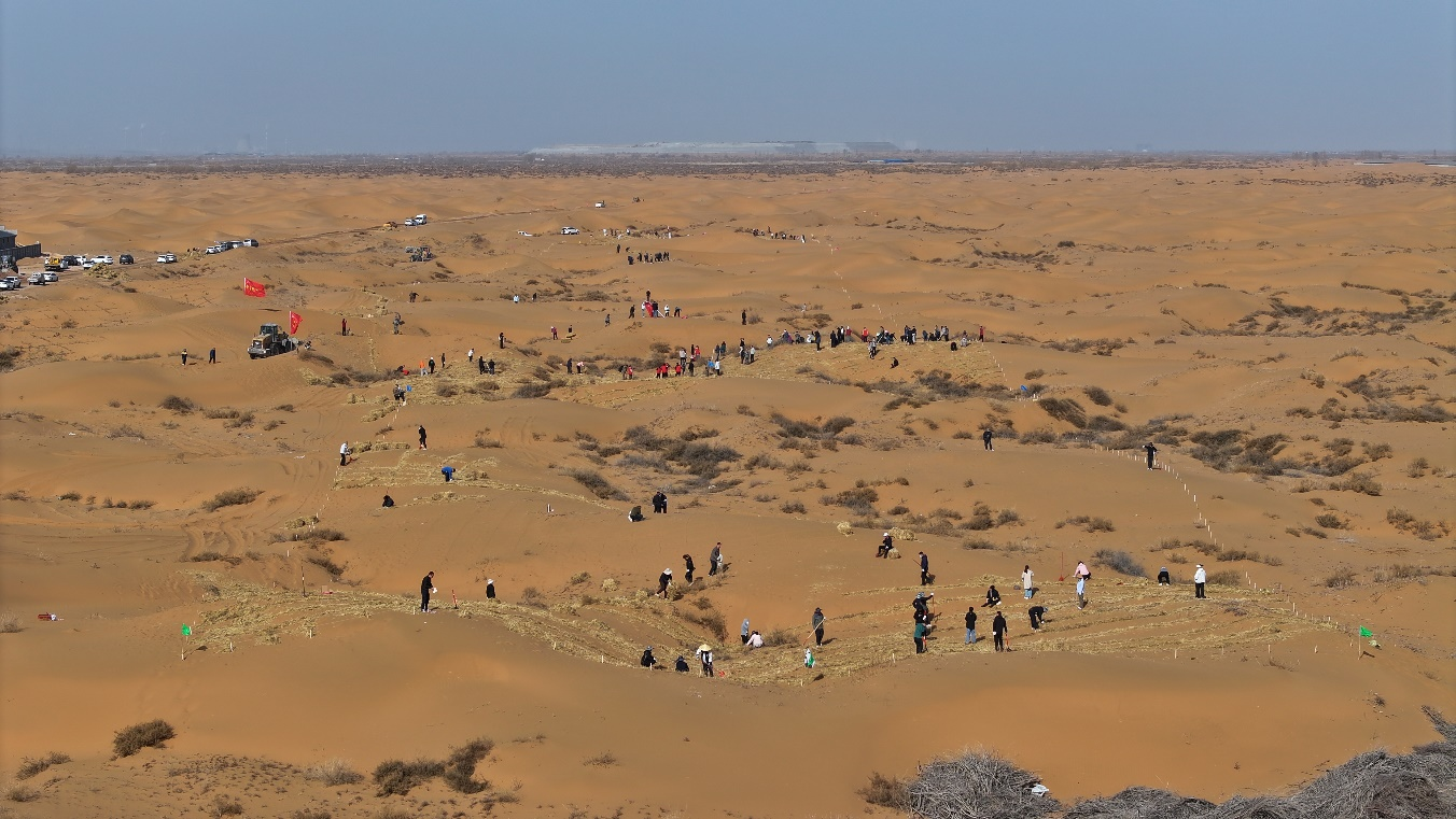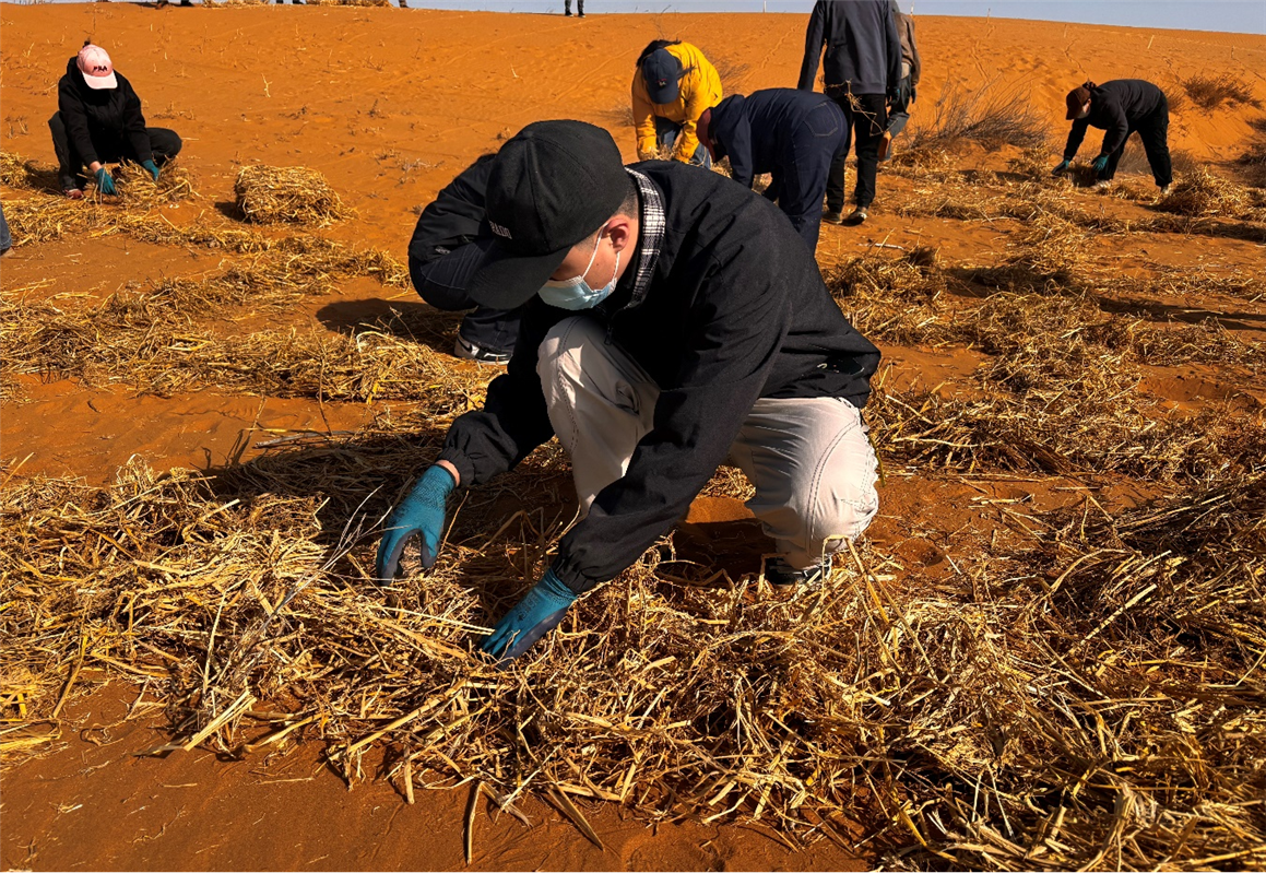 活动现场,干部群众分工协作、有条不紊。首先在沙丘上均匀播撒沙打旺、草木樨、柠条等耐旱、耐风蚀、适宜本地生长的草种。随后,有的划线定距,有的搬运稻草,有的挥锹压埋,一铲铲、一锹锹,将一束束稻草精准地压入沙层,构筑起纵横交错的“平铺式沙障”,从高空俯瞰,连绵的沙丘仿佛被披上了一层坚固的“黄金甲”。