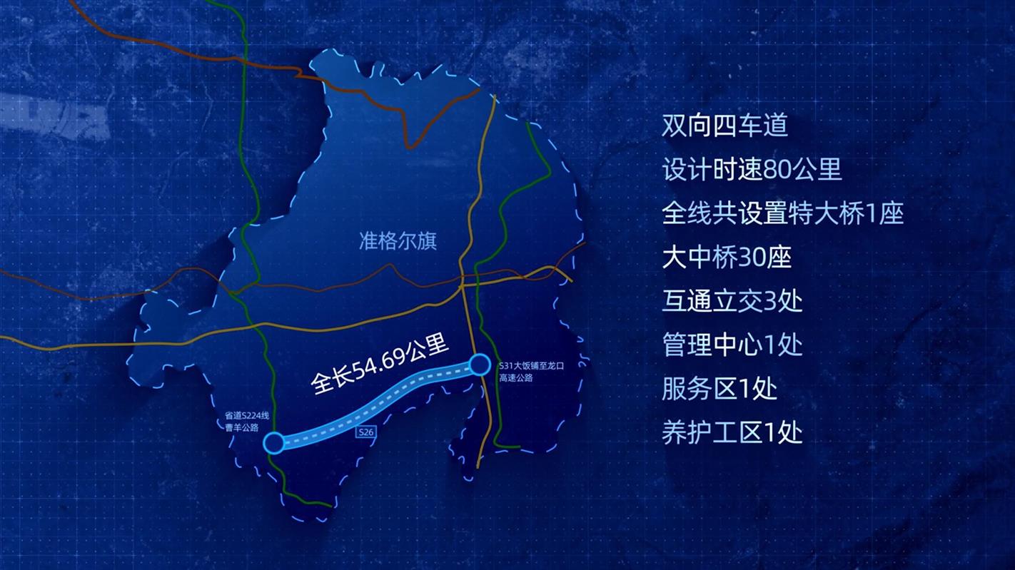 项目主线起点位于纳日松镇闫路梁村,终点位于薛家湾镇长滩村西,总投资约70亿元,全长54.69公里,采用了高填深挖,结合高架桥的设计方案,全线共设置特大桥1座,大中桥30座及其他配套设施。2024年,项目全面开工建设,截至目前路基工程完成约60%,桥梁工程完成约30%,预计2027年建成通车。