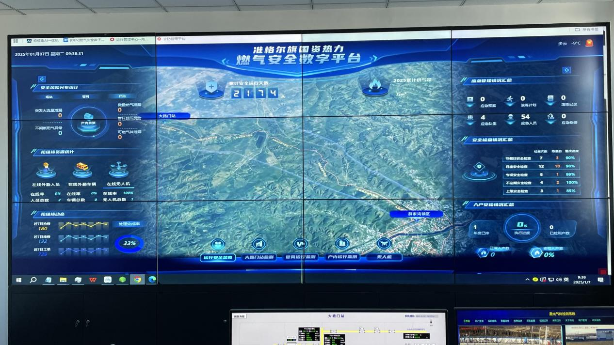 除了常规的入户排查外,准格尔旗国资燃气热力公司坚守岗位职责,利用智慧化云处理技术通过燃气安全数字平台,有效检测天然气工艺区各种运行参数,利用激光检测云台,无人机航线飞行,实时扫描检测工艺区设备连接处、沿线各运行管路是否存在可燃气体的微小泄漏,同时站控人员通过物联网流量计,可以对管路内天然气运行压力、流量等数据实时掌握,构建了一张覆盖场站、管网、户内的全方位智慧安全网。该系统不仅实现了运维的便捷移动化、数据的直观可视化,还推动了业务管理的一体化与管理决策的智能化,大大提升了应急响应速度与联动处理效率。