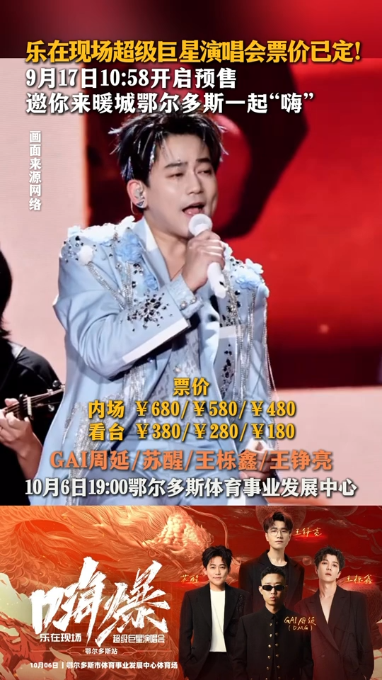 乐在现场超级巨星演唱会票价已定!9月17日10:58开启预售 邀你来暖城鄂尔多斯一起“嗨”