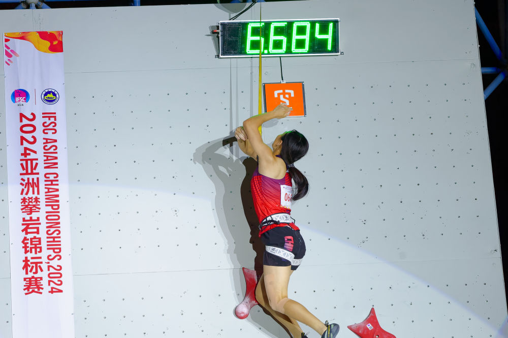 女子四强有三个席位被中国选手占据,9月末刚刚加冕全国冠军的蒙世雪在半决赛和决赛中连续刷新个人最好成绩摘金,夺冠成绩为6秒68。被问到连破个人纪录的秘诀时,蒙世雪笑称:“我也不知道,可能我想拿冠军,就只能冲。心里会想别人都那么强了,我还怕什么呢?全程都在用心冲的话,我就不会去想别的什么,就算我(中途)失误了,我也会很快纠正那个动作,然后继续爬。”